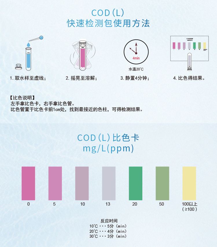 本產(chǎn)品中COD(化學(xué)需氧量)測量方法所使用的氧化劑會(huì)隨反應(yīng)時(shí)間和反應(yīng)溫度不同而導(dǎo)致反應(yīng)速率變化,用戶在使用過程中需注意顯色時(shí)間及水樣溫度,溫度在10 ℃左右顯色為5分鐘,20 ℃左右顯色為4分鐘,30 ℃左右顯色為3分鐘。由于COD表征的是一個(gè)綜合的指標(biāo),而本產(chǎn)品使用的氧化劑不是對(duì)所有物質(zhì)都起作用,所以本產(chǎn)品的檢測結(jié)果通常比消解后獲得的結(jié)果偏低。