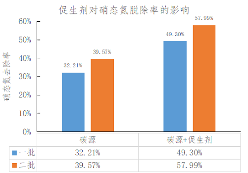 促生劑對反硝化脫氮的促進(jìn)作用:以某廠化工污水生化處理過程中的脫氮效果為例,添加水體十萬分之一的促生劑能夠提升17.09%-18.42%的硝態(tài)氮脫除率。
