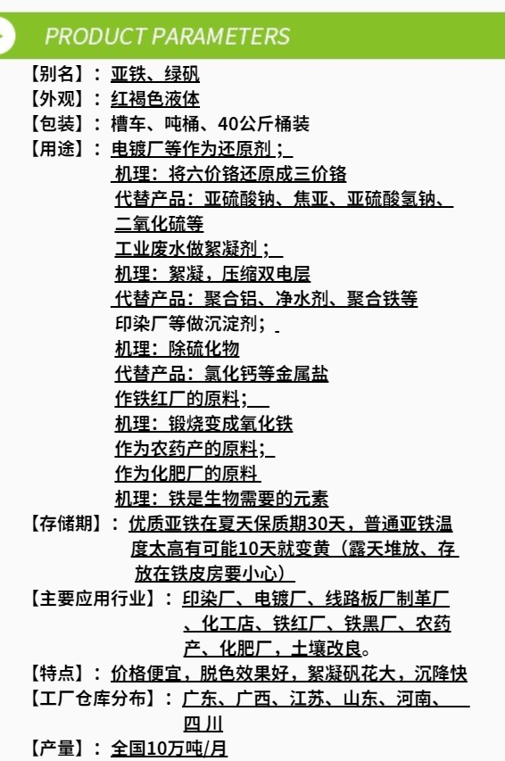 長隆科技硫酸亞鐵:別名:亞鐵、七水硫酸亞鐵、綠礬、烘干型硫酸亞鐵,用途可作為電鍍廠等作為還原劑,工業(yè)廢水做絮凝劑,印染廠等做沉淀劑,作鐵紅廠的原料,作為農(nóng)藥廠的原料,作為化肥廠的原料,硫酸亞鐵花卉中施肥等等。