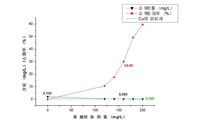 解決方案:使用我司重金屬捕捉劑03型加藥到160PPM之后總銅從2.14降到0.28ppm,達(dá)到要求持續(xù)加總銅可以降低至0.16ppm以下。